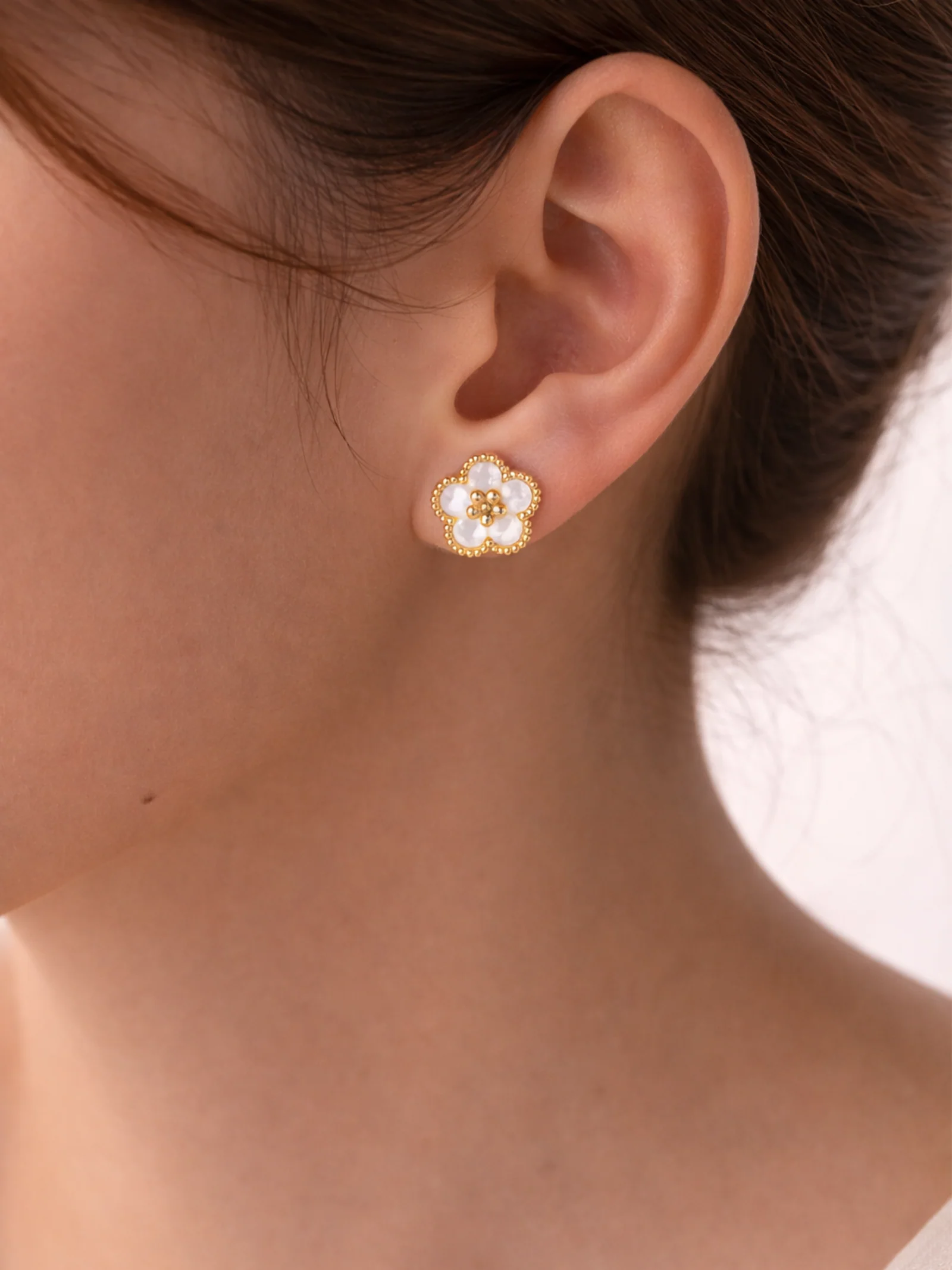 At the heart of each flower lies a delicate Mother of Pearl inlay, reflecting a spectrum of soft colors with every movement. Clean in form and perfectly balanced, these studs sit comfortably on the ear—offering a polished look that transitions seamlessly from a focused workday to a relaxed evening out.